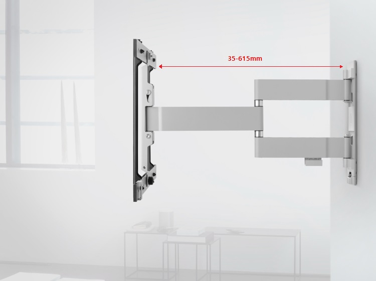 Die zweiarmige Konstruktion erlaubt einen außergewöhnlich großen Wandabstand von 61,5 cm. Der minimale Wandabstand von 3,5 cm ist nicht weniger beeindruckend. Völlige Freiheit bei der Positionierung Ihres Fernsehers!