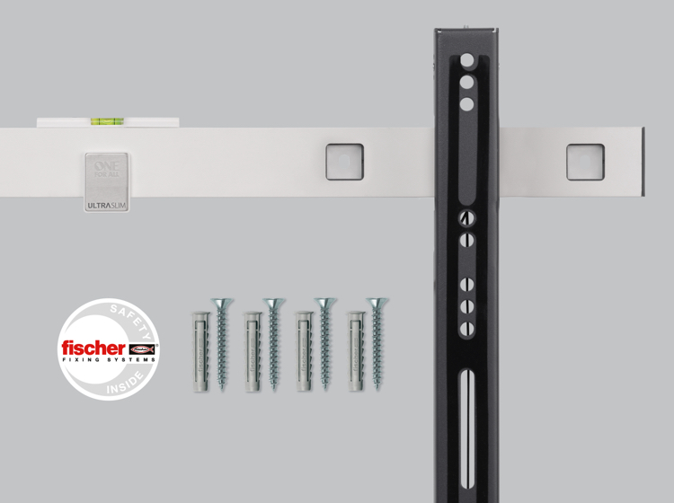 All mounting materials such as screws, fischer plugs, concrete anchors and spacers are delivered with the wall mount. A spirit level is also included for a quick and straightforward setup.
